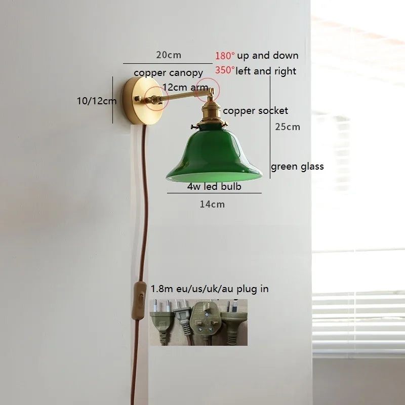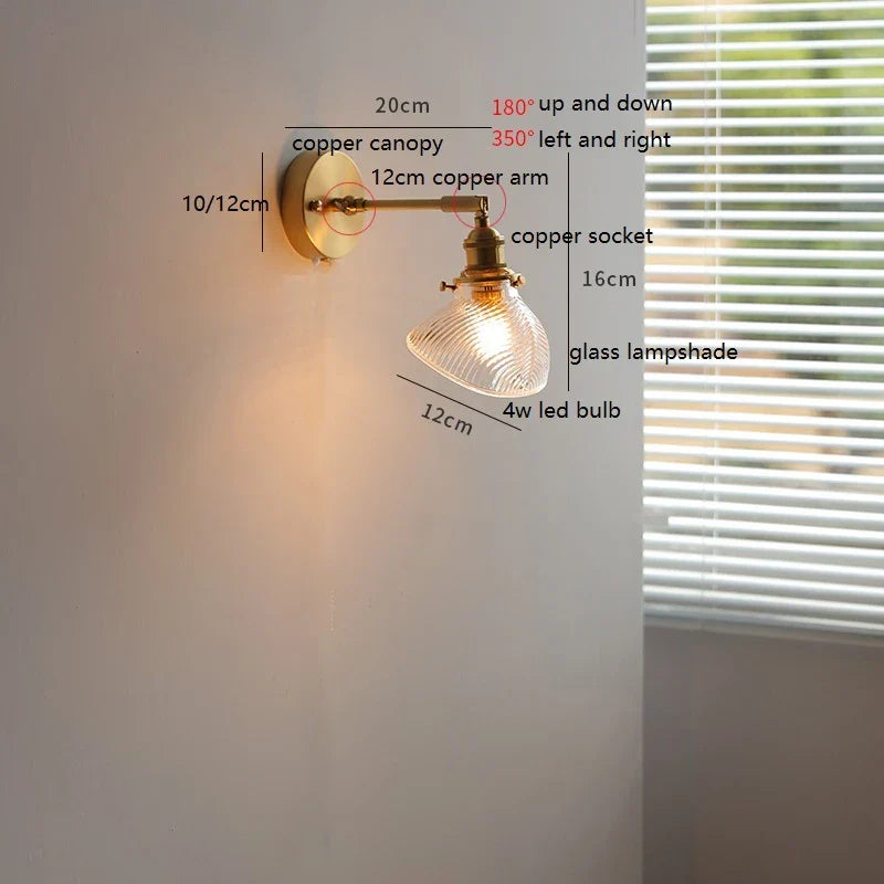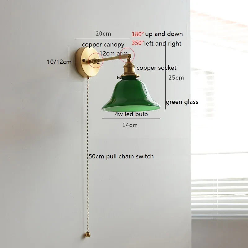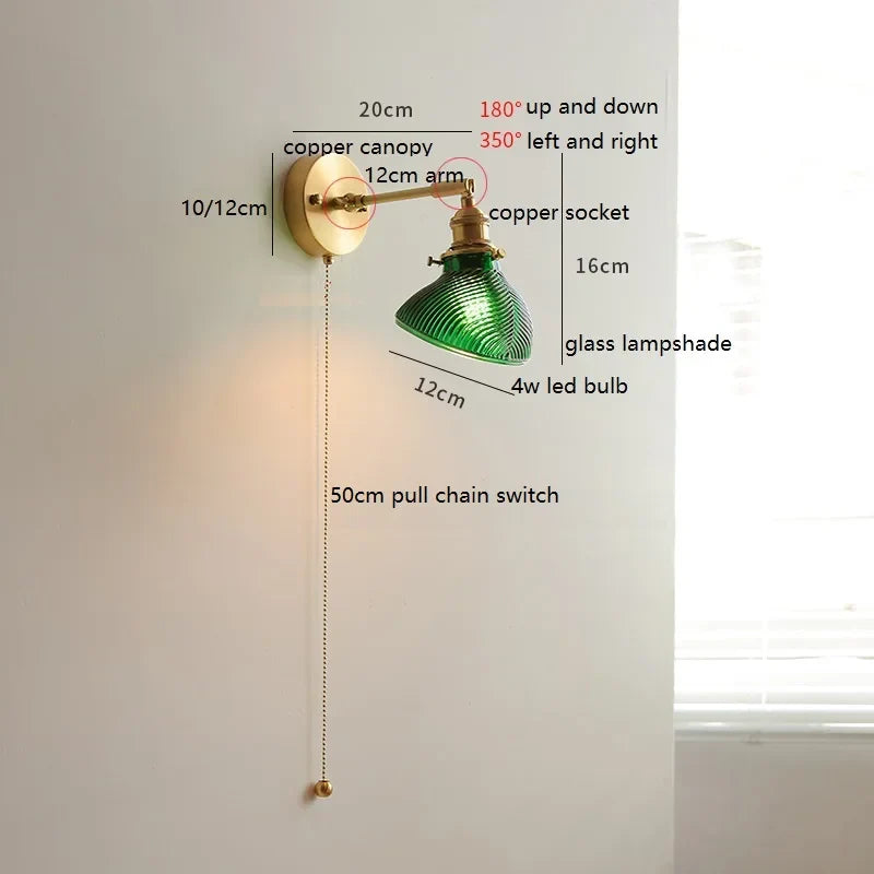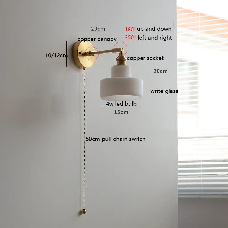 Helnys Glass LED Wall Light Sconce Rotate Pull Chain Switch Bedroom Lamp
