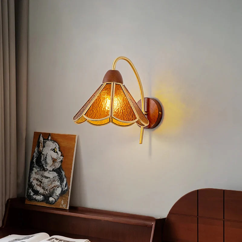 Helnys Gold Antique Brass Amber Glass LED Wall Sconce - Industrial Vintage Bedside Lamp