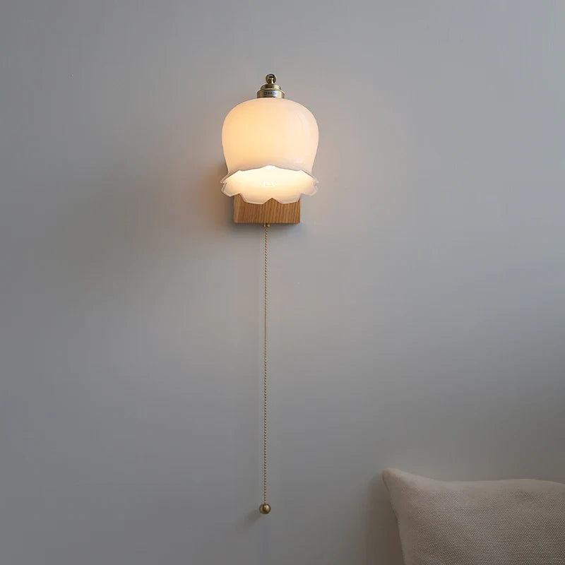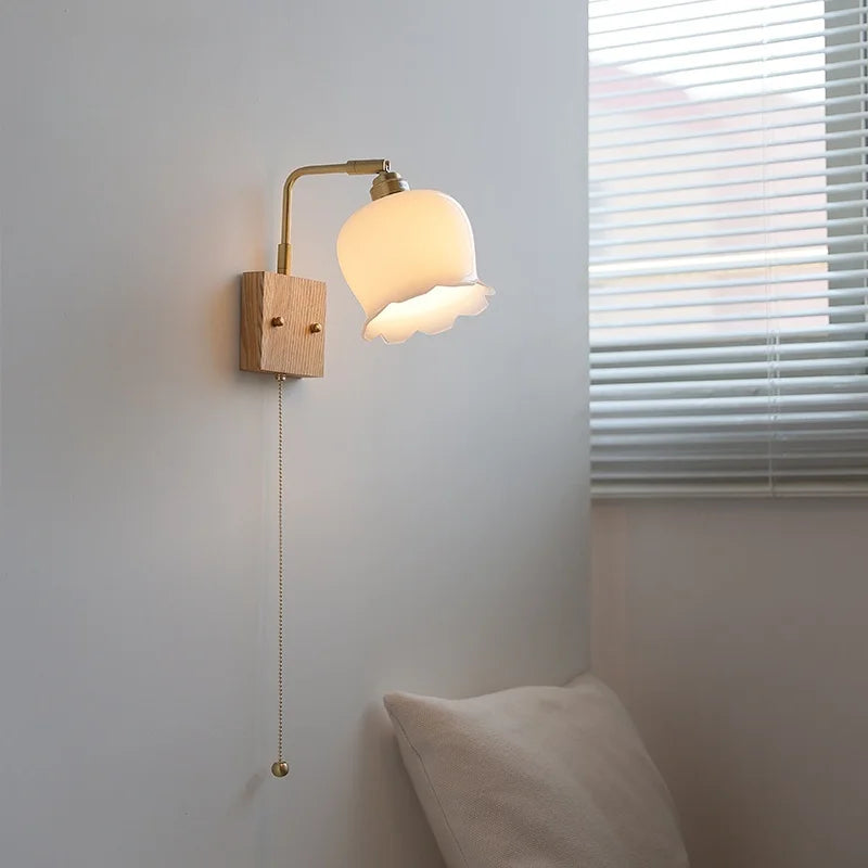 Helnys Nordic Decor LED Wall Sconce Gold Brass White Glass Pull Chain Bedroom Bedside Lamp