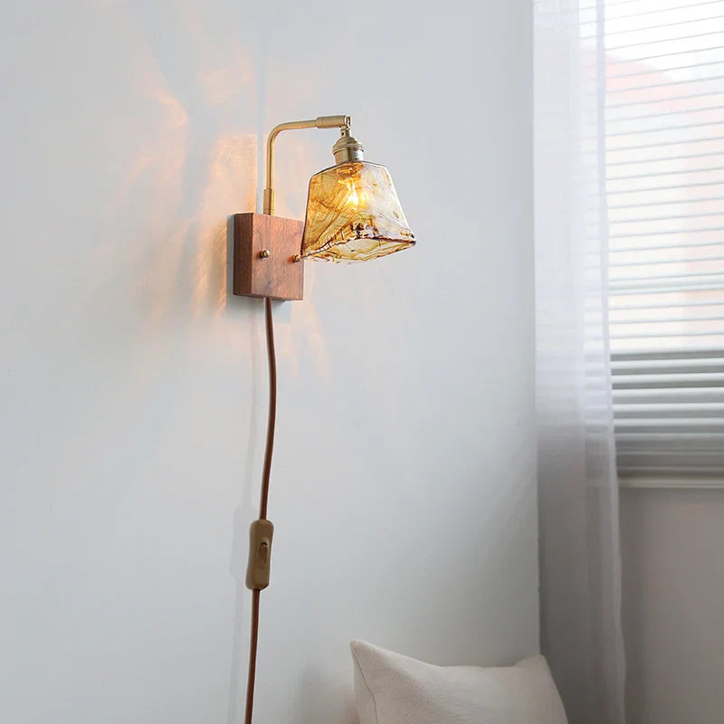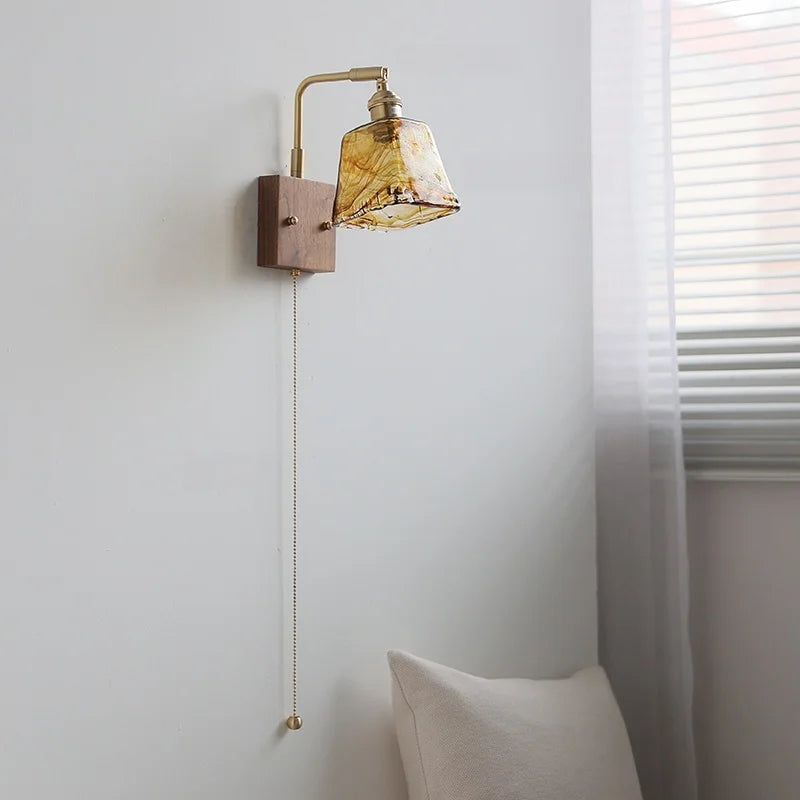 Helnys LED Wall Lamp Amber Glass Wood Switch Living Room Stair Light