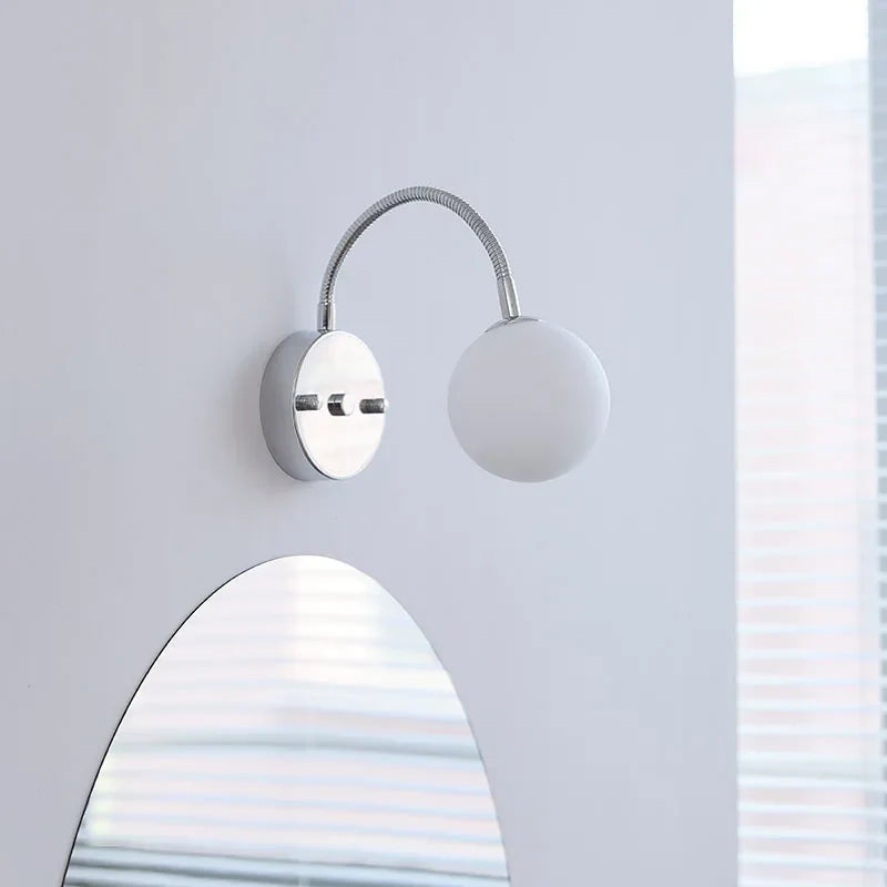 Elevate your modern bedroom with the Helnys Silver Hose LED Wall Lamp featuring a sleek design and a white glass ball for a touch of elegance.